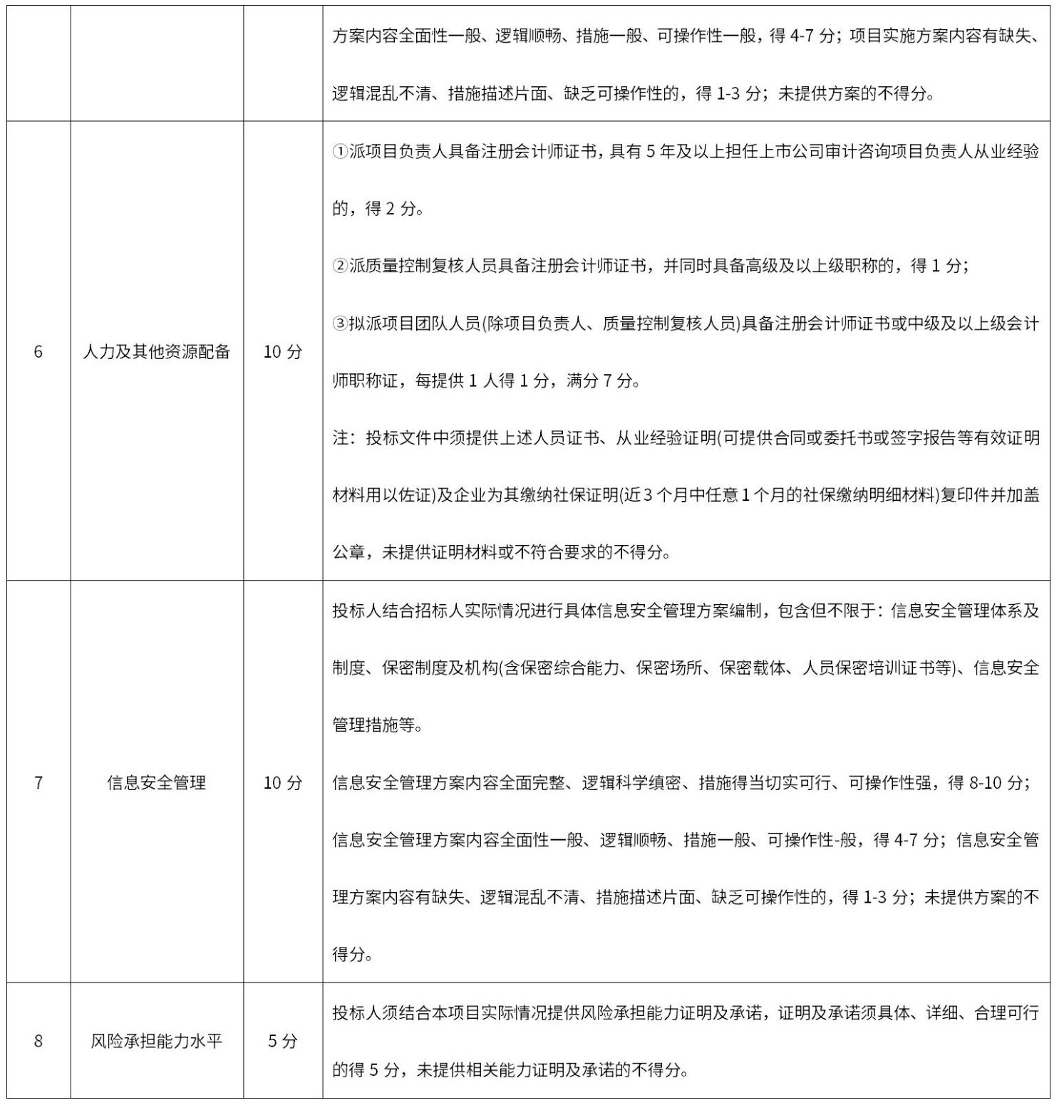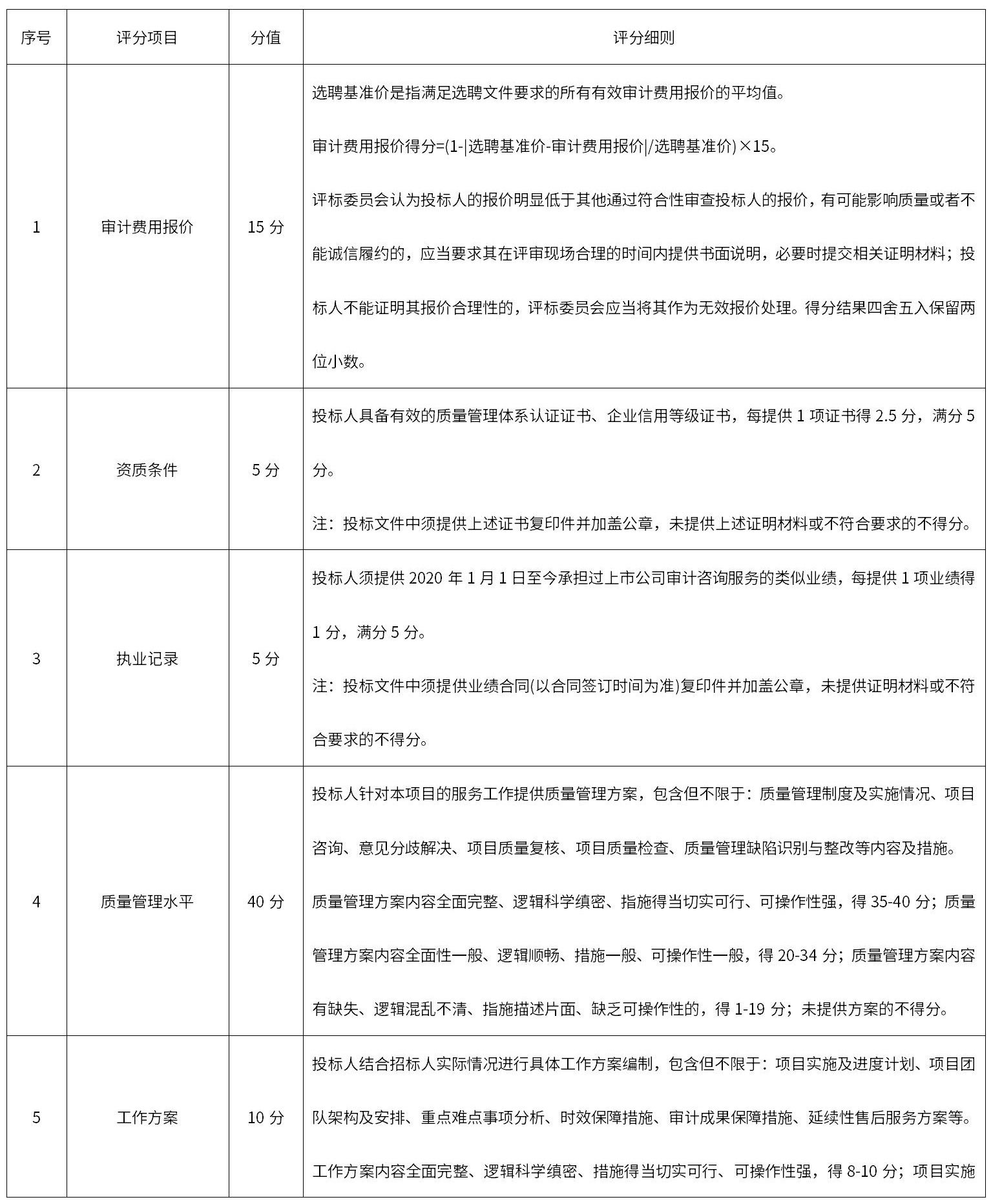 本項(xiàng)目擬采用綜合評(píng)估法進(jìn)行評(píng)分,滿(mǎn)分100分。評(píng)價(jià)要素為:審計(jì)費(fèi)用報(bào)價(jià)、會(huì)計(jì)師事務(wù)所的資質(zhì)條件、執(zhí)業(yè)記錄、質(zhì)量管理水平、工作方案、人力及其他資源配備、信息安全管理、風(fēng)險(xiǎn)承擔(dān)能力水平等。