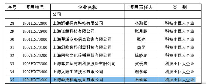 2019年度上海市科技小巨人工程立項(xiàng)名單: